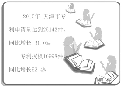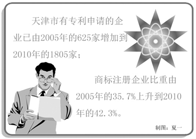 “十一五”期间,天津全市普遍开展各种形式的宣传活动和培训活动,参与人员累计达到6万余人次。天津全市有专利申请的企业数由2005年的625家增加到2010年的1805家,5年间增长了1.9倍;商标注册企业的比重由2005年的35.7%上升到2010年的42.3%。2010年,近700家企事业单位实现专利申请“零突破”,天士力、天堰科技、亚安科技等一批企业专利申请超过50件,金锚集团年专利授权已超过百件。