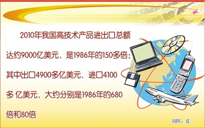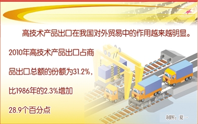 高技术产业的快速发展带动了我国高技术产品进出口贸易的不断扩大。据统计,2010年我国高技术产品进出口总额达约9000亿美元,是1986年的150多倍;其中出口4900多亿美元,进口4100多亿美元,大约分别是1986年的680倍和80倍;进出口贸易实现了由1986年的逆差42.7亿美元到2010年顺差约800亿美元的转变。高技术产品出口在我国对外贸易中的作用越来越明显。2010年高技术产品出口占商品出口总额的份额为31.2%,比1986年的2.3%增加了28.9个百分点。
