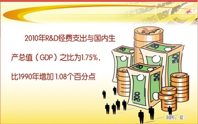 据初步统计,2010年全社会研究与试验发展(R&D)经费支出达6980亿元,是1990年的56倍,年均增长22.3%;按全国人口计算的人均R&D支出为522元,是1990年的47倍;2010年R&D经费支出与国内生产总值(GDP)之比为1.75%,比1990年增加1.08个百分点,表明社会资源配置对于自主研发的倾斜逐年加大。