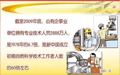 截至2009年底,公有企事业单位拥有工程技术人员、农业技术人员、科学研究人员、卫生技术人员和教学人员等专业技术人员2888万人,是1978年的6.7倍,是新中国成立初期自然科学技术工作者人数的60倍左右。