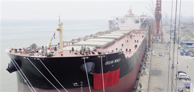 6月3日,由广州中船龙穴造船有限公司建造的23万载重吨矿砂船“OCEAN WORLD”(环球轮)交付使用。该船总长325米,型宽52.5米,型深24.3米,续航力30000海里,主要用于载运矿砂,同时也可载运煤炭。 卢汉欣摄(新华社发)