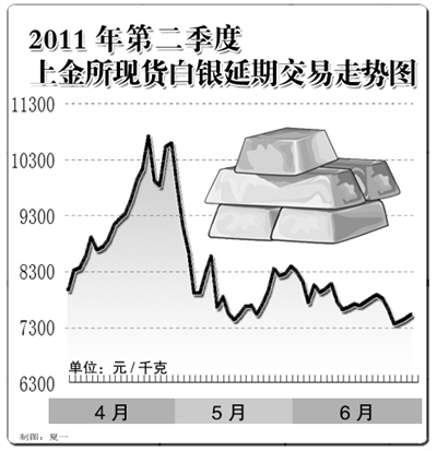 截至6月29日收盘,上海黄金交易所白银递延Ag(T+D)合约为7462元/千克,比4月1日收盘价下跌6.40%。在此期间,沪银Ag(T+D)最高曾于4月下旬达到10788元/千克。4月当月市场交投热情高涨,累计成交近3.33万吨,环比增长64.77%,同比大增1641.87%;累计成交金额3174.33亿元,环比增长106.05%,同比增长高达3981.43%。而在近期,最少的一天成交量仅有37万手。