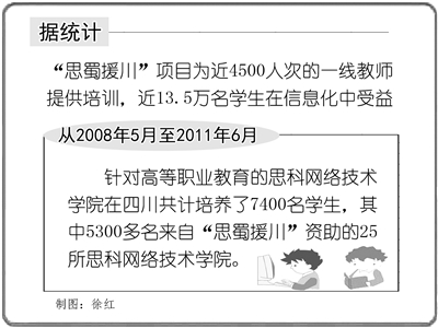 据统计,“思蜀援川”项目为近4500人次的一线教师提供了培训,近13.5万名学生在信息化中受益。从2008年5月至2011年6月,针对高等职业教育的思科网络技术学院在四川共计培养了7400名学生,其中5300多名来自“思蜀援川”资助的25所思科网络技术学院。