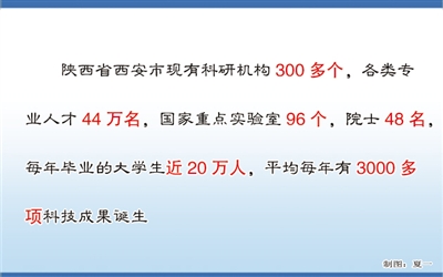 虽然地处西部,但陕西西安的科技实力紧随北京、上海之后,位居全国第三,优势明显。据介绍,西安市现有科研机构300多个,各类专业人才44万名,国家重点实验室96个,院士48名,每年毕业的大学生近20万人,平均每年有3000多项科技成果诞生。