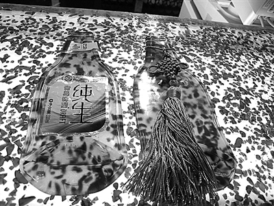 中图 用废旧青岛啤酒瓶进行二次循环利用制作的托盘。