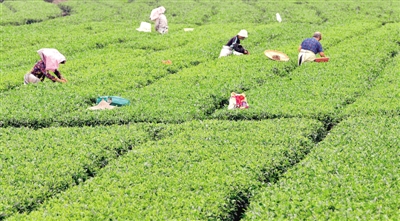 7月10日,茶农在昭平县城郊的高山茶园上采摘夏茶。近日,广西昭平县10万多亩高山茶园陆续进入夏茶采摘高峰期,每天约有上万名茶农上山赶采夏茶。