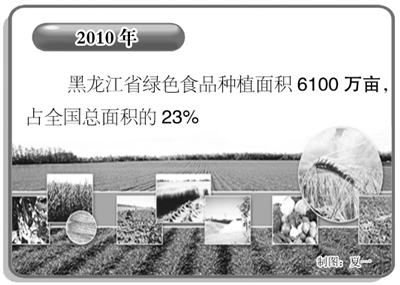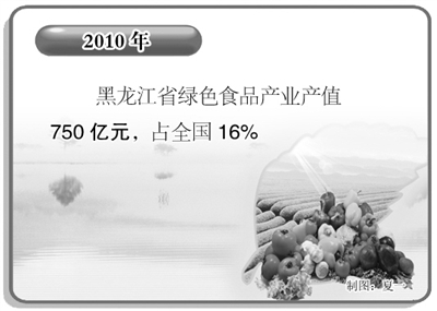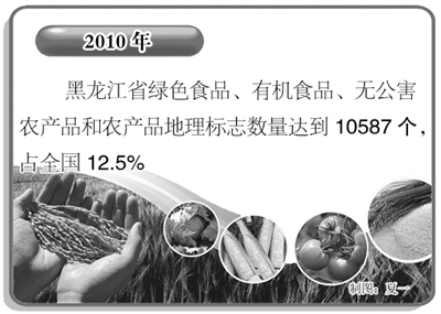 自2000年以来,黑龙江省坚持实施“打绿色牌,走特色路”的发展战略,取得了显著成效。2010年,该省绿色食品种植面积6100万亩,占全国总面积的23%;绿色食品、有机食品、无公害农产品和农产品地理标志数量达到10587个,占全国12.5%;绿色食品产业产值750亿元,占全国16%。10多年来,黑龙江省绿色食品经济总量、认证数量和种植面积等主要指标增长均达10倍以上,发展规模和速度居全国首位。