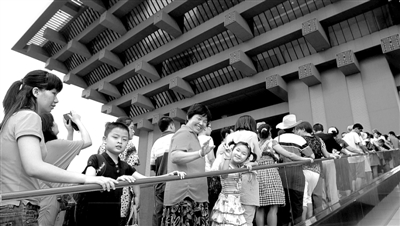7月12日,观众沿自动扶梯而上进入中国馆参观。当日,上海世博会中国馆再次对外开放。这次再开放从7月12日起至10月9日止,将持续3个月。
