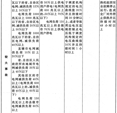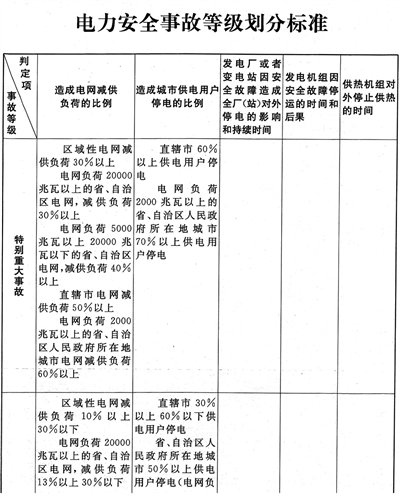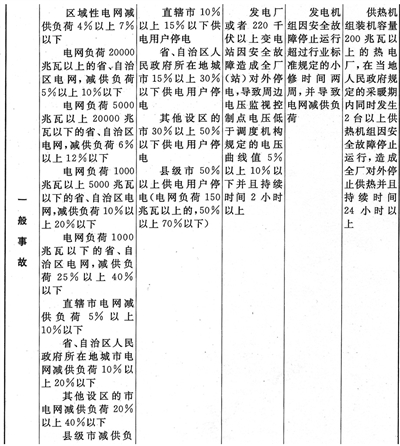 第三条 根据电力安全事故(以下简称事故)影响电力系统安全稳定运行或者影响电力(热力)正常供应的程度,事故分为特别重大事故、重大事故、较大事故和一般事故。事故等级划分标准由本条例附表列示。事故等级划分标准的部分项目需要调整的,由国务院电力监管机构提出方案,报国务院批准。