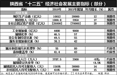 2010年,陕西省经济总量突破万亿元大关,站在一个新的起点上谋划未来,加速转型发展、科学发展成为鲜明的主题。一位参与陕西省“十二五”规划纲要起草的专家告诉记者,“陕西省‘十二五’时期要以保障和改善民生为落脚点,着力破解城乡居民收入水平低、城市化水平低和经济外向度低三大难题,全面推进富民强省十大工程,努力实现‘经济综合实力上台阶、人民生活水平和质量上台阶、生态环境保护上台阶’,到2015年进入全国中等发达省份行列,2020年建成西部强省,与全国同步进入全面小康。”