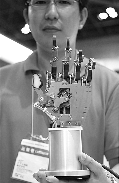 日前,机器技术展览会在东京国际展览中心开幕,会上展示了多种用于医疗、生活和救灾的机器和机器人。图为工作人员在展览会上展示可以进行遥控操作的机器手。