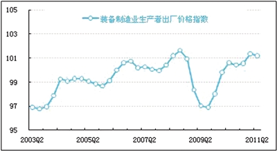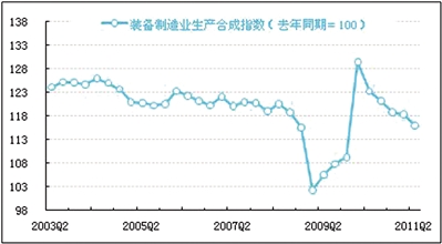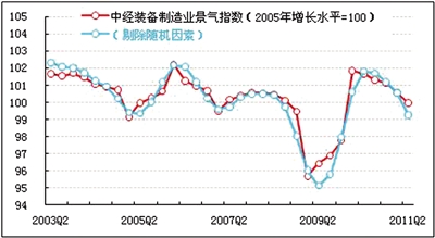 景气:2011年二季度中经装备制造业①景气指数为100.0点(2005年增长水平=100②),比上季度回落0.5点,自2010年二季度开始已连续五个季度回落。