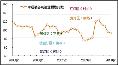 预警:2011年二季度,中经装备制造业预警指数为93.3点,比上季度回落3.4点,运行至“绿灯区”偏下位置,考虑到去年基数相对较高的影响,目前行业运行仍处于正常状态。