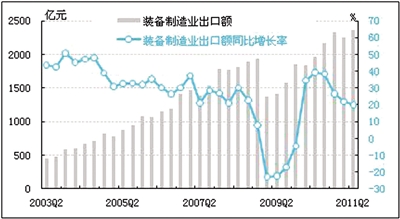经初步季节调整,2011年二季度,我国装备制造业出口额为2357.4亿元,同比增长20.1%,同比增速较一季度回落1.9个百分点,环比增长4.9%;装备制造业出口交货值占装备制造业产品销售收入的比重为25.2%,比2010年全年26.3%的平均水平低了1.1个百分点,仍属于历史较低水平。以上数据表明,推动装备制造业增长的主要动力仍是国内需求。