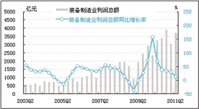 经初步季节调整,2011年二季度,装备制造业实现利润总额为3706.5亿元,同比增长13.3%,同比增速较一季度回落16.6个百分点;装备制造业利润占全部制造业利润的份额为37.1%,比一季度提高2.2个百分点。在装备制造业的子行业中,通用、专用设备制造业的利润增长超过全部工业27.9%的平均利润增长水平,而交通运输设备制造业和通信设备、计算机及其他电子设备制造业的利润增长大幅放缓,拉低了整个装备制造业的利润增长水平。
