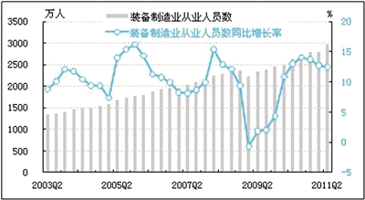 经初步季节调整,2011年二季度末,装备制造业从业人员数为2969.2万人,同比增长12.4%,同比增速比一季度回落0.3个百分点。装备制造业各子行业从业人员增速均快于全部工业平均增长率。其中,通信设备、计算机及其他电子设备制造业从业人员增长最快,专用设备制造业次之。