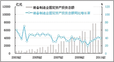 经初步季节调整,2011年二季度,装备制造业固定资产投资总额为8201.6亿元,同比增长39.6%,同比增速较一季度减缓1.8个百分点。装备制造业各子行业的投资增速均明显高于全部工业26.0%的平均增长水平,尤其是电气机械及器材制造业、仪器仪表及文化、办公用机械制造业和通信设备、计算机及其他电子设备制造业的投资增速达到50%以上,其余3个子行业的投资增速也在30%以上。