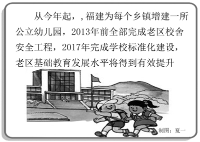 今年“七一”前夕,福建又为老区列出了一个项目单:从今年起,每个乡镇增建一所公立幼儿园,2013年前全部完成老区校舍安全工程,2017年完成学校标准化建设,老区基础教育发展水平将得到有效提升。一幅科学发展、跨越发展的画卷正徐徐展开。