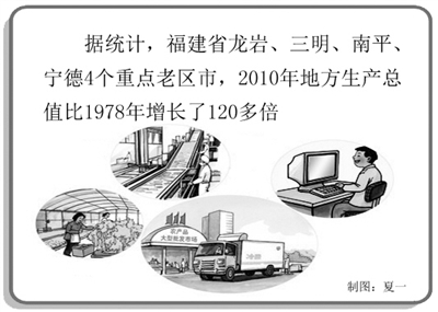 如今,拥有全省45%人口的红土地,已经从全省最为贫穷的区域发展为整体接近全省平均水平。据统计,龙岩、三明、南平、宁德4个重点老区市,2010年地方生产总值比1978年增长了120多倍。全省原中央苏区县基本实现小康,老区村中有一部分已开始向全面小康迈进。