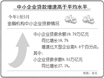 近段时间以来,全社会普遍反映企业贷款难度加大,但各金融机构给予中小企业的贷款依然高于所有贷款增速。据相关统计显示:今年1至5月,金融机构中小企业贷款余额19.79万亿元,同比增长18.7%,增速比大型企业高8.4个百分点。其中,小企业贷款余额9.53万亿元,同比增长27.1%。