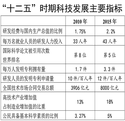 原始创新能力显著提升。“十一五”期间,我国国际科学论文总量由世界第5位上升到第2位,被引用次数由世界第13位上升到第8位。“十二五”时期,科学和技术重点领域将取得重大突破,国际科学论文被引用次数将进入到世界前5位。每万人发明专利拥有量由目前的1.7件上升到3.3件,研发人员发明专利申请量达到12件/百人年。