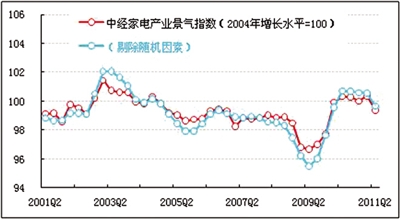 景气:2011年二季度,中经家电产业①景气指数为99.4点(2004年增长水平=100②),比上季度回落1.0点③。