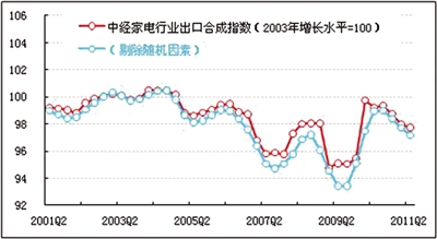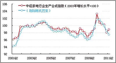 在进一步剔除随机因素后,家电行业出口合成指数亦连续下降(见图表中蓝色曲线),本季度随机因素拉动指数上涨0.5点。欧债问题、美国经济增长放缓、日本地震的后续影响、西亚北非局势不稳等等,使世界经济的不确定性在二季度显得较为突出。家电出口需求难以在短时间内得到迅速恢复。同时,人民币汇率的调整,对我国家电行业的出口构成了影响。