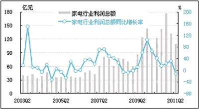 2011年二季度,经初步季节调整,家电行业利润总额为108.7亿元,同比下降11.1%,同比增速由正转负;环比下降17.5%,环比降幅略有所收窄。二季度家电行业销售利润率为2.7%,较上季度下降0.7个百分点,低于本季度全部工业6.2%的平均水平。