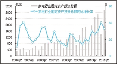 2011年二季度,经初步季节调整,家电行业固定资产投资总额为2948.5亿元,同比增长49.7%,环比增长108.3%,同比增速较上季度回落11.4个百分点。二季度家电行业固定资产投资增长仍处于较高水平,但是其利润率的下滑、产成品库存的增加,有可能影响行业的投资信心,预计三季度家电行业固定资产投资有可能继续回落。