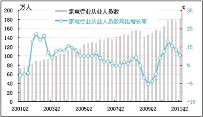 截止到2011年二季度末,家电行业全部从业人员数为182.9万人,同比增长10.5%,增速较上季度回落3.0个百分点。 其中,家用视听设备制造业全部从业人员数为56.2万人,同比增长13.5%,增速较上季度回落6.4个百分点;家用电力器具制造业全部从业人员数为126.7万人,同比增长12.1%,增速较上季度回落1.4个百分点。家电行业从业人员数同比增速已经连续3个季度出现回落,但其用工规模仍处于高位,回落幅度比较有限。