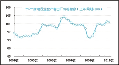 2011年二季度,家电行业生产者出厂价格同比上涨2.0%,与上季度相比下降了0.2个百分点。当前,稳定物价总水平仍然是宏观调控的首要任务。近期,国际大宗商品价格也出现调整,上游生产者购进价格的涨势也有所放缓,预计家电行业生产者出厂价格将继续稳中有降。