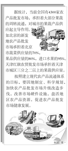 按照建立现代农产品流通体系的目标,要因地制宜、科学规划,加快农产品批发市场升级改造步伐,改善市场硬件设施,盘活地区农产品资源,促进农产品批发市场健康发展。