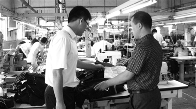 7月20日,交行北京中关村园区支行工作人员在北京雅尚经典服装服饰有限公司了解企业生产经营情况。(曹阳供图)