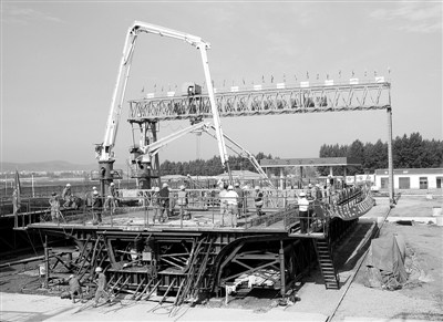 7月21日,建筑工人在施工。当日,由中国铁建二十二局集团承建的吉林省吉(林)图(们)珲(春)铁路客运专线第五标段延吉制梁场成功打出全线第一孔箱梁。吉图珲铁路客运专线建成后与长吉城际铁路共同构成长春至珲春快速客运通道。 武新才摄 (新华社发)