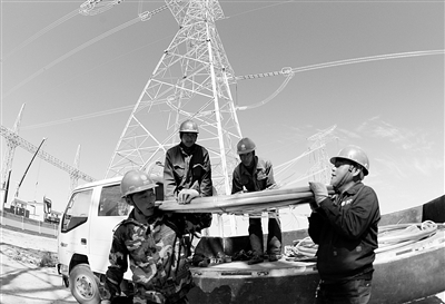 7月21日,青海火电工程公司施工人员在青藏联网工程750千伏乌兰开关站加紧安装电气设备。青藏联网工程750千伏乌兰开关站位于青海省中部的乌兰县,是青藏联网工程交流部分的重点工程之一,目前,该站土建部分基本完成,电气部分正在紧张施工。 王 文摄 (新华社发)