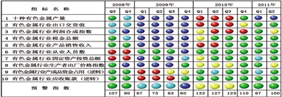 灯号:2011年二季度,在构成中经有色金属产业预警指数的10个指标(仅剔除季节因素,保留随机因素)中,位于“绿灯区”的有7个指标——有色金属行业出口交货值、税金总额、产品销售收入、从业人员数、固定资产投资总额、产成品资金占用(逆转)及应收账款(逆转);位于“黄灯区”的有2个指标——有色金属行业利润合成指数和生产者出厂价格指数;位于“蓝灯区”的有1个指标——十种有色金属产量⑤。