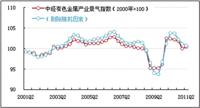 值得关注的是,在剔除随机因素后,2011年二季度中经有色金属产业景气指数为100.7点,比未剔除随机因素的中经有色金属产业景气指数高0.2点,两条曲线接近重合。这显示,随着国家推进节能减排、淘汰落后产能等一系列宏观调控政策的落实,有色金属行业的发展正日趋合理。