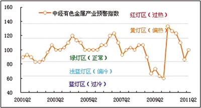 中经有色金属产业景气指数报告显示,2011年二季度中经有色金属产业景气指数为100.5点,比上季度提升0.5点;中经有色金属产业预警指数为100.0点,比上季度提升13.3点,在“绿灯”区间中心线上运行。