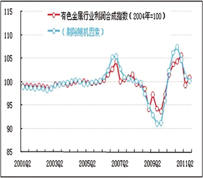 2011年二季度有色金属行业利润合成指数为100.9点(2004年增长水平=100),比上季度提升1.6点,在上季度较大幅度下行之后开始回升。剔除随机因素后,2011年二季度有色金属行业利润合成指数为100.1点,比未剔除随机因素的有色金属行业利润合成指数低0.8点,比上季度下降1.2点,已连续三个季度呈下行走势。表明2011年二季度,政策因素对有色金属行业盈利水平的提升起到了一定的拉动作用。预计三季度有色金属行业利润总体状况将保持稳定。