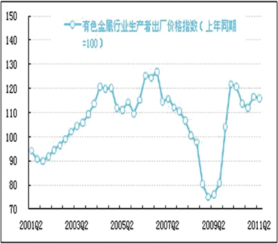 2011年二季度,有色金属行业生产者出厂价格同比上涨15.8%,涨幅比上季度收窄0.8个百分点,价格水平依然保持高位。