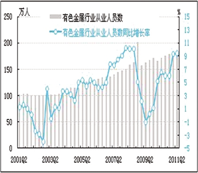 截至2011年二季度末,有色金属行业从业人员数为179万人,比上季度增加5万人,环比增长2.8%;同比增长9.4%,同比增速与上季度基本持平,微升0.1点。