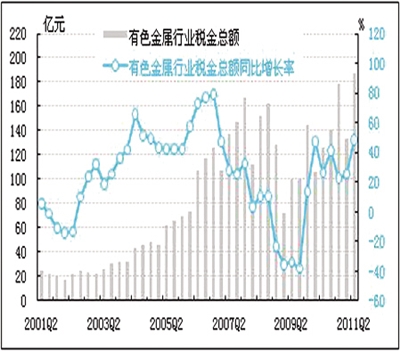 经初步季节调整,2011年二季度有色金属行业税金总额为187.7亿元,比上季度增加54.4亿元,环比增长40.8%;同比增长48.1%,同比增速比上季度加快22.9个百分点。税金总额同比增速加快,表明有色金属行业对国家税收的贡献率提高。预计三季度有色金属行业税金总额同比增速可能继续加快。