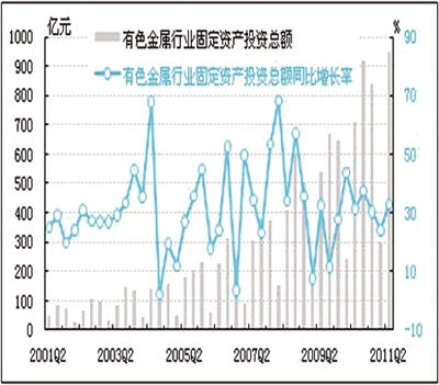 经初步季节调整,2011年二季度有色金属行业固定资产投资总额为946.6亿元,同比增长32.8%,同比增速比上季度加快8.6个百分点。