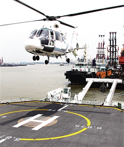7月23日,一架直升机正从“中国海监50”船甲板上起飞。当日,在国家海洋局东海分局上海码头举行“中国海监50”船入列仪式,这是继海监83船之后,又一艘综合性能达到世界领先水平的三千吨级中远程海监执法公务船。新华社记者 陈 飞摄