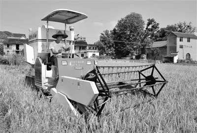 7月23日,江西德兴市黄柏乡农民开着收割机收割早稻。 胡敦煌摄(新华社发)