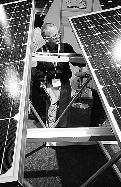 2011北美国际太阳能科技展览会于近日在美国旧金山开幕,来自30多个国家和地区的800多家太阳能展商参展。图为一名参观者在观看展品。 新华社发