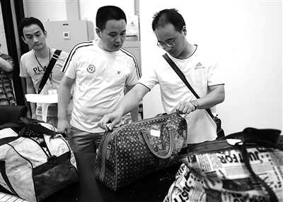 7月26日,在温州南站,潘先生(右一)正在替他的母亲认领行李。