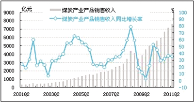经初步季节调整,2011年二季度,煤炭产业产品销售收入为7639亿元,同比增长35.7%,同比增速比上季度放缓0.7个百分点;环比增长6.6%,环比增速比上季度放缓0.4个百分点。