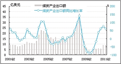 经初步季节调整,2011年二季度,我国煤炭产业出口额为9.3亿美元,同比增长62.6%,同比增速比上季度快速回落15.2个百分点;环比下降0.6%。