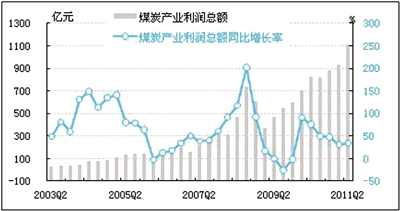 经初步季节调整,2011年二季度,煤炭产业实现利润总额1116.5亿元,同比增长34.3%,同比增速比上季度加快2.9个百分点;环比增长19.8%,环比增速比上季度加快14.4个百分点。